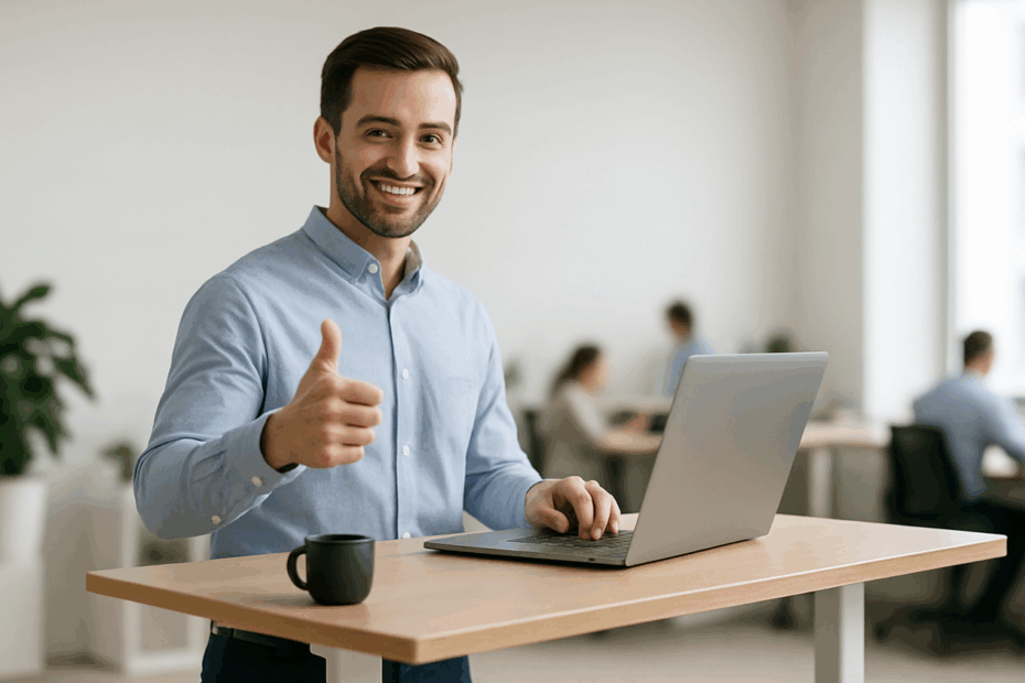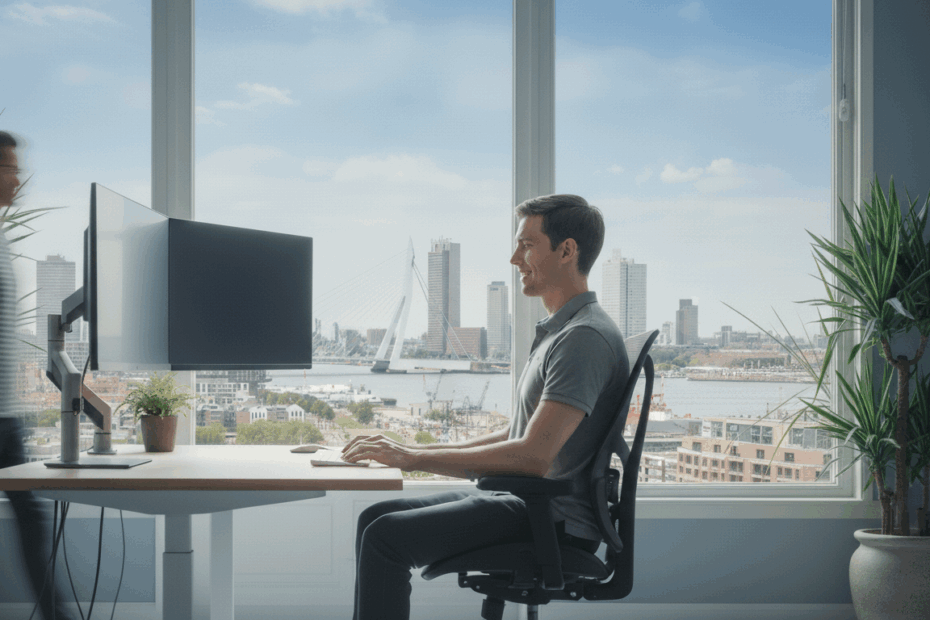 Een goede werkplek gaat verder dan een mooi bureau en een snelle computer. Het draait om balans: je lichaam ondersteunen, je focus vasthouden en je energie behouden. Deze foto laat precies zien hoe dat eruit… Zo ziet ergonomie er in de praktijk uit